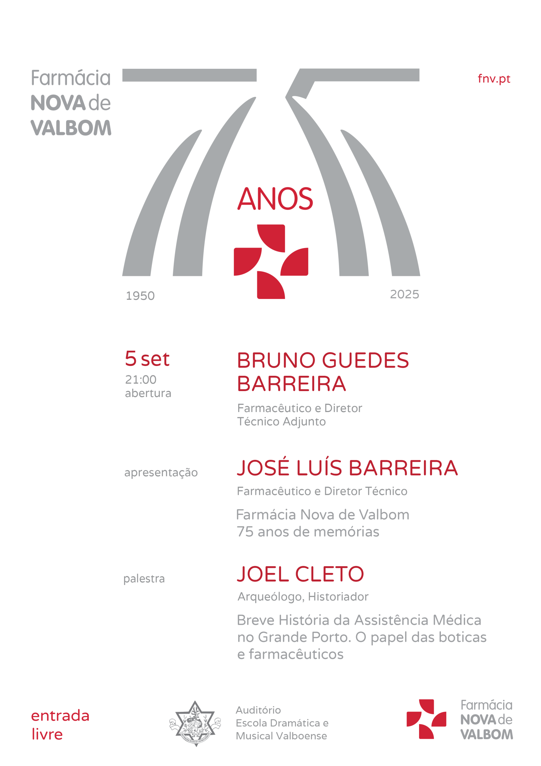 TACITUS NOS 75 ANOS DA FARMÁCIA NOVA DE VALBOM Setembro 6, 2025 A TACITUS colaborou, através de uma conferência de Joel Cleto, nas comemorações dos 75 anos da Farmácia Nova de Valbom. “Breve História da Assistência Médica no Grande Porto. O papel das boticas e farmacêuticos” foi o tema desta intervenção, que decorreu num totalmente lotado Auditório da Escola Dramática e Musical Valbonense na noite de 5 de setembro 2025. Fotos e reportagem: Partilhe esta informação com os seus amigos… FacebookGoogle Twitter Pinterest Linkedin Print Navegação de artigos TORRE DOS CLÉRIGOS NA FEIRA DO LIVRO DO PORTO, COM COLABORAÇÃO DA TACITUSVISITA AO CEMITÉRIO DO BONFIM