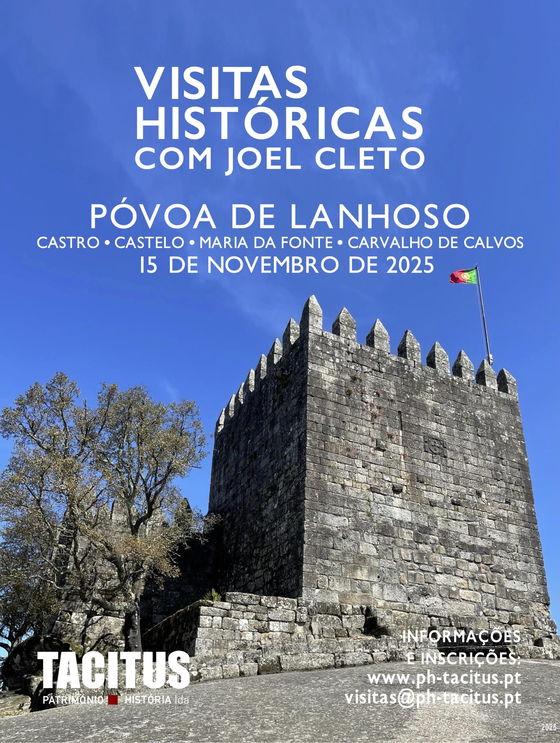 TACITUS NA PÓVOA DE LANHOSO Outubro 23, 2025 A TACITUS vai promover durante o próximo dia 15 de novembro uma visita guiada por Joel Cleto a Póvoa de Lanhoso com passagem, entre outros locais e monumentos, pelo castro de Lanhoso (e seu núcleo reconstruído), castelo de Lanhoso (incluindo o espaço museológico na torre de menagem), santuário da Senhora do Pilar, monumento a “Maria da Fonte” e igreja de São Salvador de Fontarcada (onde teve início a famosa revolta popular), e ao Centro Interpretativo do Carvalho de Calvos, árvore classificada e uma das mais antigas do país, com cerca de 500 anos. 15 de novembro. Das 9 às 19:00/19:30 Local de partida e chegada: Rotunda da Boavista Valor de inscrição por pessoa: 90 euros Inscrições: visitas@ph-tacitus.pt A inscrição contempla: visita guiada por Joel Cleto transporte em autocarro de turismo disponibilização de equipamento radioguia/auricular para melhor acompanhar as explicações seguro de acidentes pessoais almoço no restaurante “Avenida”, no centro da vila (prato principal: bacalhau à moda da casa) entradas em todos os monumentos acima referidos Inscrição e Pagamento:1. Manifeste a sua vontade em participar através do email visitas@ph-tacitus.pt, indicando o seu nome completo, número de contribuinte (para emissão da posterior fatura-recibo) e, se possível, telemóvel. 2. Nos três dias seguintes a equipa da TACITUS confirmará a disponibilidade de vaga. Após esta nossa confirmação dispõe de 5 dias para proceder ao pagamento através de transferência bancária: para a conta PT50 0036 01579910007788035 do Montepio Geral, em nome de PH Tacitus Lda., devendo enviar por email o comprovativo do pagamento. 3. Num prazo de dois dias um email de “confirmação de inscrição” é enviado pela TACITUS ao participante. 4- Mais próximo da iniciativa a TACITUS envia email com algumas informações, incluindo o ponto de encontro da atividade. Política de cancelamento de inscrição:Caso pretenda anular a sua inscrição, poderá fazê-lo com direito ao reembolso na íntegra até 10 dias antes da realização da visita. A partir dessa altura não nos é possível efectuar qualquer reembolso. Política de cancelamento da atividade:A visita só terá lugar com um mínimo de 30 participantes. Caso a visita seja cancelada pela razão acima apontada ou por motivos meteorológicas ou de força maior, o participante poderá escolher uma destas opções:a) participar da visita na sequência do seu reagendamento.b) reembolso total do valor pago aquando da inscrição. Informamos ainda que, durante a iniciativa, serão recolhidas imagens fotográficas (e eventualmente vídeo) para divulgação das mesmas nas redes sociais. Ao inscrever-se nesta actividade está a autorizar a captação de imagens para os referidos fins. Responsável pelo tratamento de dados: ph-tacitus@ph-tacitus.pt Partilhe esta informação com os seus amigos… FacebookGoogle Twitter Pinterest Linkedin Print Deixe um comentárioO seu endereço de email não será publicado. Campos obrigatórios marcados com *Comentário * Nome Email Site Guardar o meu nome, email e site neste navegador para a próxima vez que eu comentar. Navegação de artigos LIVRO “TORRE DOS CLÉRIGOS”, EDITADO PELA TACITUS, NO ATMOSFERA MA TORRE DOS CLÉRIGOS. EXPOSIÇÃO DE SÉRGIO JACQUES