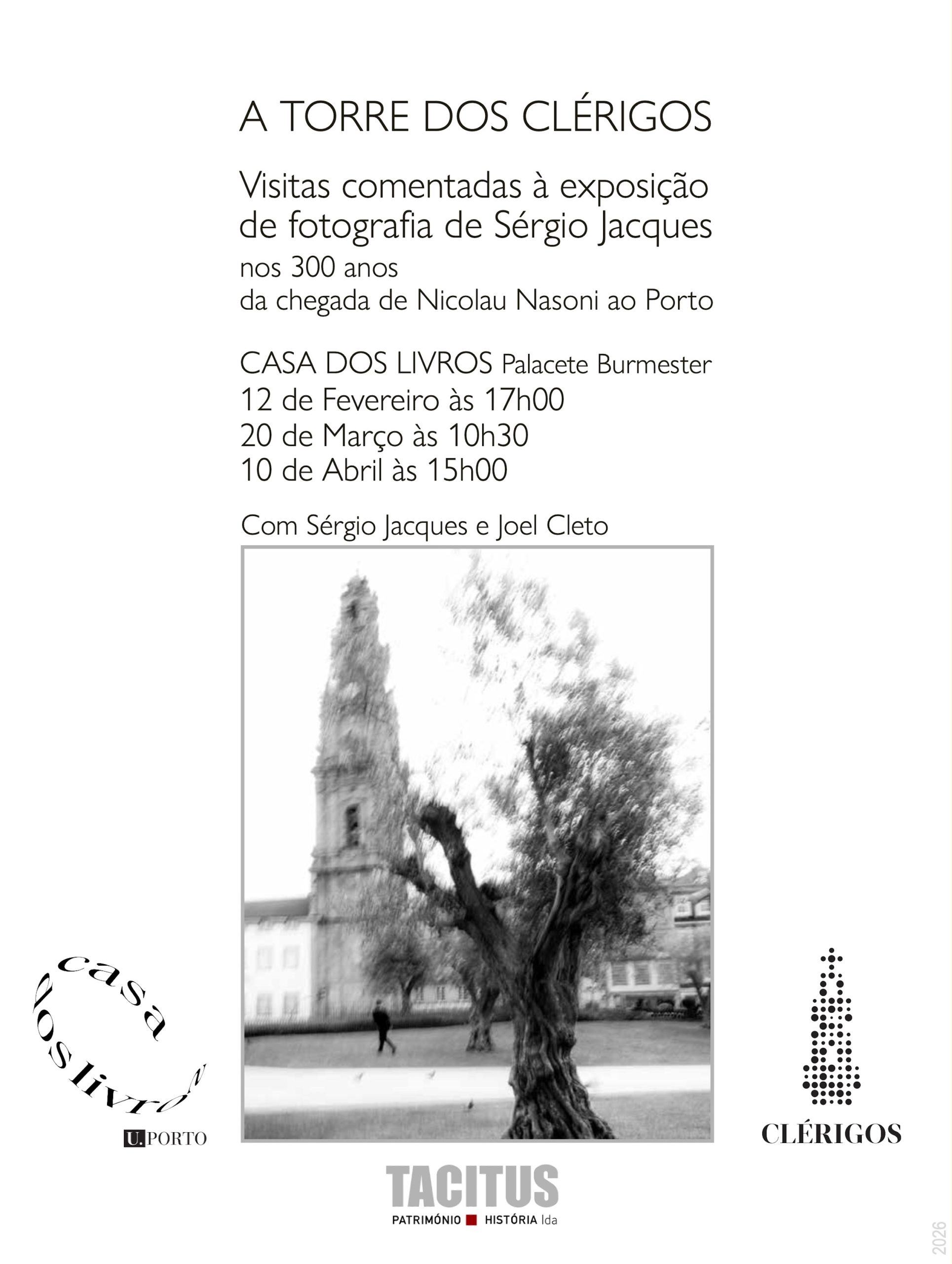 VISITAS COMENTADAS À EXPOSIÇÃO “TORRE DOS CLÉRIGOS” DE SÉRGIO JACQUES Fevereiro 8, 2026 No âmbito da exposição fotográfica “A Torre dos Clérigos” de Sérgio Jacques terão lugar, durante o período em que a mesma estará patente na “Casa dos Livros” da Universidade do Porto, algumas “visitas comentadas” asseguradas por Sérgio Jacques com a colaboração de Joel Cleto. Estes serão, também, momentos de apresentação do livro-catálogo da exposição, incluindo sessão de autógrafos. Neste livro, que reúne as fotografias da exposição fotográfica de Sérgio Jacques, encontra igualmente excertos literários sobre este monumento de autores como Florbela Espanca, Eugénio de Andrade, Luís Veiga Leitão, Jorge de Sena, Miguel Torga, Urbano Tavares Rodrigues, Almada Negreiros, Teixeira-Gomes e José Saramago. Um texto de Joel Cleto sobre o autor da Torre – o arquiteto Nicolau Nasoni – integra também a publicação. Ainda sobre este livro ver : https://www.facebook.com/PHTacitus/videos/1115893867094301/ Datas: 12 de fevereiro, 17h; 20 de março, 10:30; e 10 de abril, 15h Local: Casa dos Livros da Universidade do Porto, Palacete Burmester, rua do Campo Alegre, 1055, Porto. Acesso gratuito Preço do livro-catálogo: 15€ Partilhe esta informação com os seus amigos… FacebookGoogle Twitter Pinterest Linkedin Print Deixe um comentárioO seu endereço de email não será publicado. Campos obrigatórios marcados com *Comentário * Nome Email Site Guardar o meu nome, email e site neste navegador para a próxima vez que eu comentar. Navegação de artigos A HISTÓRIA SERVE-SE QUENTE